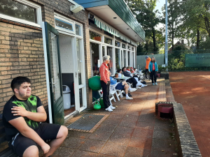 Nog snel voor aanvang werden de gravelbanen droog gesponst en daarna konden de 30 deelnemers aan het toernooi aan de slag. Wilma Koller had weer een leuke indeling gemaakt, afgestemd op speelsterkte en nieuwe ontmoetingen, want er had zich ook een aantal nieuwere leden ingeschreven.